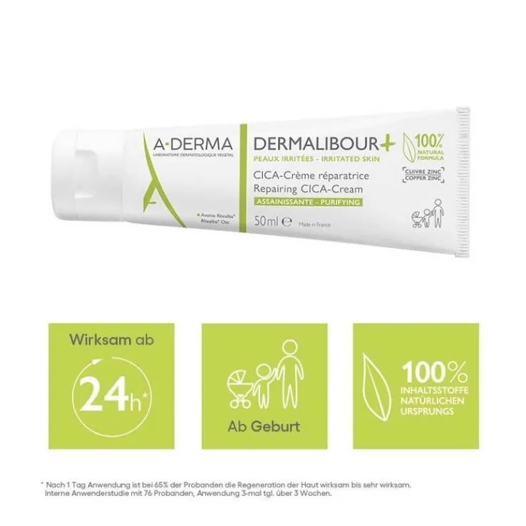 Die A-Derma Dermalibour + Cica repariernde Creme sorgt für sofortige Hautberuhigung und unterstützt eine schnelle Hautregeneration. Die Irritationen werden ab der ersten Anwendung beseitigt und das Gleichgewicht der Haut wiederhergestellt. Die Textur der Creme ist nicht fettend, nicht klebend und hinterlässt keine weißen Flecken. Die A-Derma Dermalibour + Cica repariernde Creme ist nicht komedogen und verfügt über eine hohe Wasserbeständigkeit.