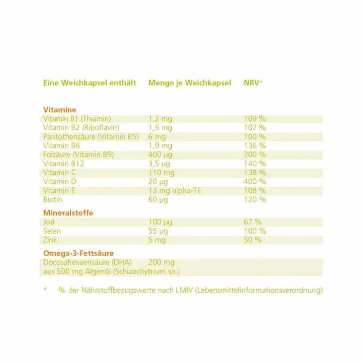 DHA-reiches Öl der Mikroalge Schizochytrium sp; Kapselhülle: modifizierte Stärke; Feuchthaltemittel: Glycerin; Stabilisator: Carragen; Sojaöl, Natriumascorbat, L-Ascorbinsäure, Emulgator: Sojalecithin; Vitamin E, Calcium-D-Pantothenat, Zinkoxid, Natriumselenit, Pyroxidinhydrochlorid, Farbstoff E172, Riboflavin, Thiaminmononitrat, Folsäure, Kaliumjodid, Biotin, Vitamin D3, Farbstoff E133, Cyanocobalamin.