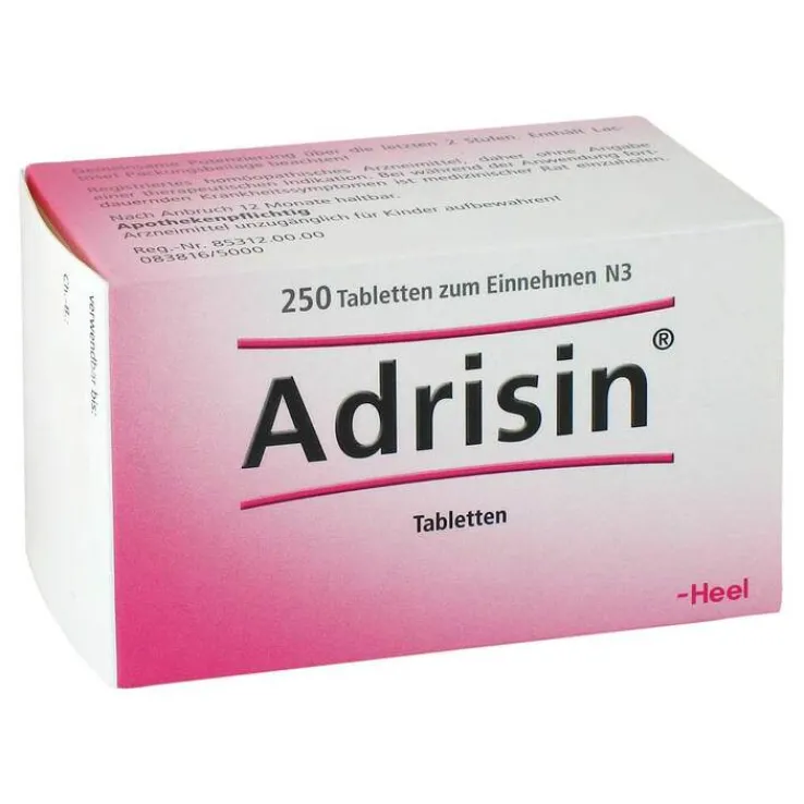Adrisin Tabletten Reg.-Nr.: 85312.00.00 Anw.geb.: Reg. homöopath. Arzneim., daher ohne Angabe einer therap. Indikation. Warnhinweise: Enth. Lactose! Packungsbeilage beachten! 1 Tablette = 0,025 BE. Zu Risiken und Nebenwirkungen lesen Sie die Packungsbeilage und fragen Sie Ihre Ärztin, Ihren Arzt oder in Ihrer Apotheke.
