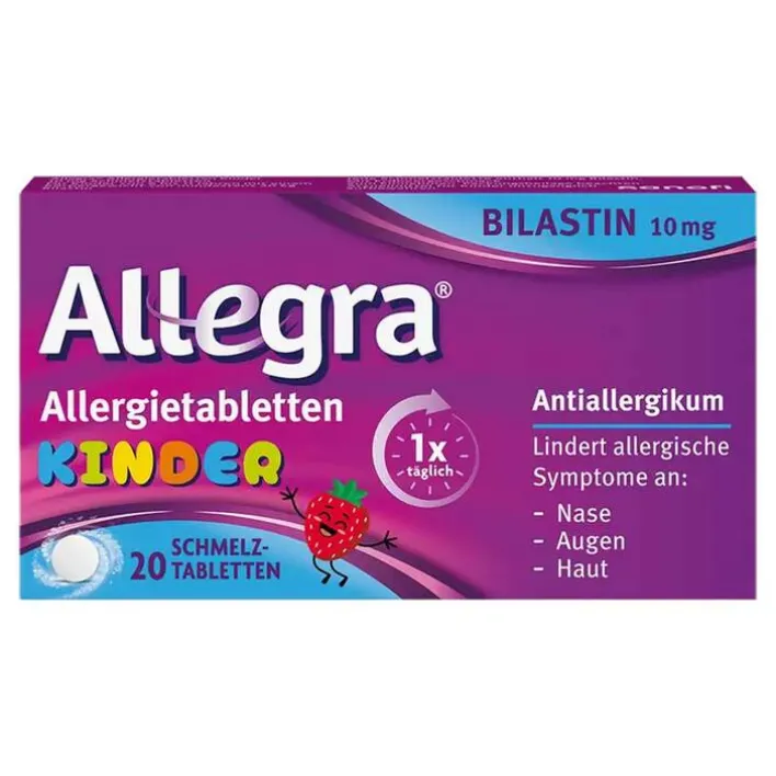 Allegra® Allergietabletten Kinder 10 mg Schmelztabletten. Wirkstoff: Bilastin. Anwendungsgebiet: Antihistaminikum. Zur Linderung der Beschwerden allergischer Rhinokonjunktivitis und Urtikaria bei Kindern im Alter von 6-11 Jahren mit einem Körpergewicht von mind. 20 kg. Apothekenpflichtig. Zu Risiken und Nebenwirkungen lesen Sie die Packungsbeilage und fragen Sie Ihre Ärztin, Ihren Arzt oder in Ihrer Apotheke. A. Nattermann & Cie. GmbH, Brüningstraße 50, 65929 Frankfurt am Main. Stand: Juni 2024 MAT-DE-2500993