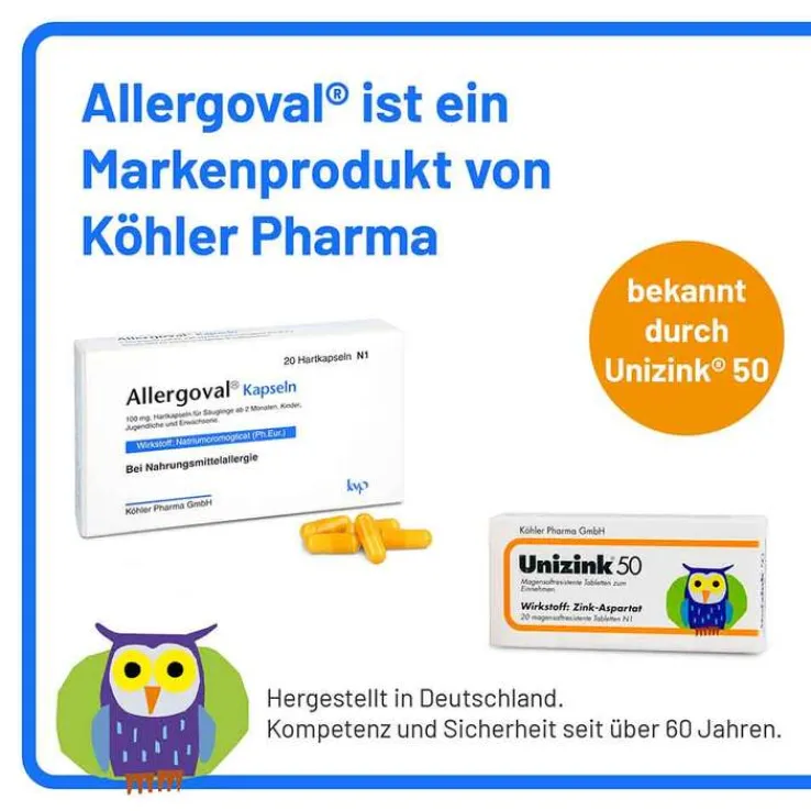 Allergoval® Kapseln.Wirkstoff: Natriumcromoglicat. Anwendungsgebiete: Nahrungsmittelallergie: Fälle von Ekzem, Nesselsucht (Urticaria), Quincke-Ödem, Hautjucken, Störungen des Magen-Darm-Traktes (Erbrechen, Brechreiz, Durchfälle, Bauchschmerz). Asthma und Nasenschleimhautentzündung (Rhinitis), bei denen Nahrungsmittelallergene die hauptsächlichen auslösenden Faktoren darstellen. Zu Risiken und Nebenwirkungen lesen Sie die Packungsbeilage und fragen Sie Ihre Ärztin, Ihren Arzt oder in Ihrer Apotheke. Köhler Pharma GmbH, Neue Bergstraße 3-7, 64665 Alsbach/Bergstraße, www.koehler-pharma.de Stand: 4/2024.
