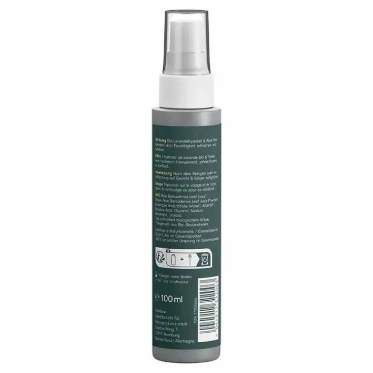 Das leichte Spray mit Bio Lavendelhydrolat spendet aktiv Feuchtigkeit, erfrischt und belebt mit den hochwertigen Wirkstoffen der Bio Aloe Vera. Es wirkt revitalisierend, ausgleichend und unterstützt die natürliche Regeneration der Haut.