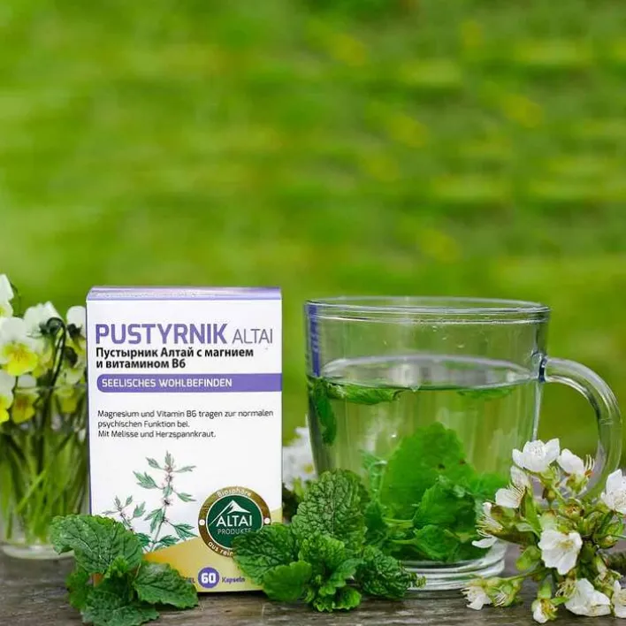 Herzspannkraut (russisch: Pustyrnik) ist seit dem Mittelalter in der Volksheilkunde bewährt. Die Kapseln enthalten zusätzlich Melisse und Magnesium und Vitamin B6. Magnesium und Vitamin B6 tragen zu einer normalen psychischen Funktion bei.