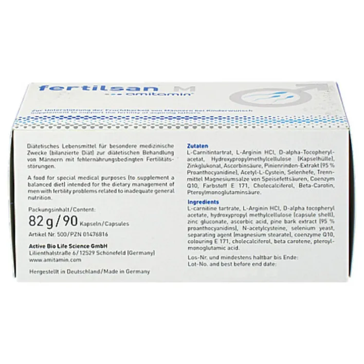 Amitamin fertilsan M ist ein Lebensmittel für besondere medizinische Zwecke (bilanzierte Diät) zum Diätmanagement bei Männern mit fehlernährungsbedingten Fertilitätsstörungen und eingeschränktem Spermiogramm.