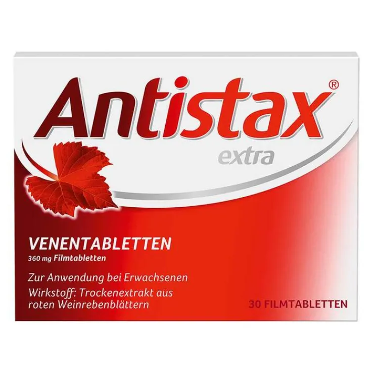 Antistax® extra Venentabletten. 360 mg Filmtabletten Zur Anwendung bei Erwachsenen Wirkstoff: Trockenextrakt aus roten Weinrebenblättern. Zur Behandlung von Beschwerden bei Erkrankungen der Beinvenen (chronische Veneninsuffizienz), die sich zum Beispiel durch Schmerzen und Schweregefühl in den Beinen, Krampfadern, nächtliche Wadenkrämpfe, Juckreiz und geschwollene Beine (Beinödeme) äußern. Zu Risiken und Nebenwirkungen lesen Sie die Packungsbeilage und fragen Sie Ihre Ärztin, Ihren Arzt oder in Ihrer Apotheke. STADA Consumer Health Deutschland GmbH, Stadastraße 2–18, 61118 Bad Vilbel Stand: Oktober 2023