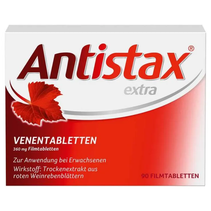 Antistax® extra Venentabletten. 360 mg Filmtabletten Zur Anwendung bei Erwachsenen Wirkstoff: Trockenextrakt aus roten Weinrebenblättern. Zur Behandlung von Beschwerden bei Erkrankungen der Beinvenen (chronische Veneninsuffizienz), die sich zum Beispiel durch Schmerzen und Schweregefühl in den Beinen, Krampfadern, nächtliche Wadenkrämpfe, Juckreiz und geschwollene Beine (Beinödeme) äußern. Zu Risiken und Nebenwirkungen lesen Sie die Packungsbeilage und fragen Sie Ihre Ärztin, Ihren Arzt oder in Ihrer Apotheke. STADA Consumer Health Deutschland GmbH, Stadastraße 2–18, 61118 Bad Vilbel Stand: Oktober 2023