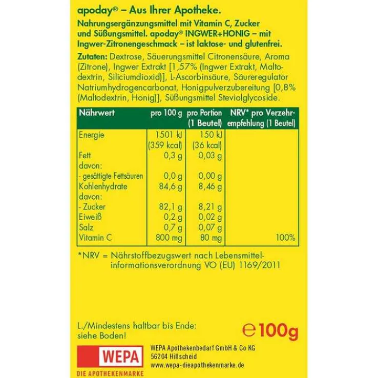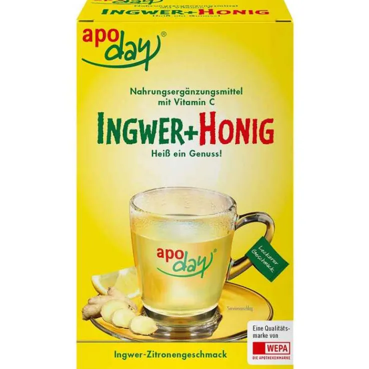 Apoday Ingwer + Honig mit Ingwer-Zitronengeschmack ist ein Nahrungsergänzungsmittel mit Vitamin C. Das Pulver ist laktosefrei, glutenfrei, ohne künstliche Farbstoffe und ohne künstliches Aroma.