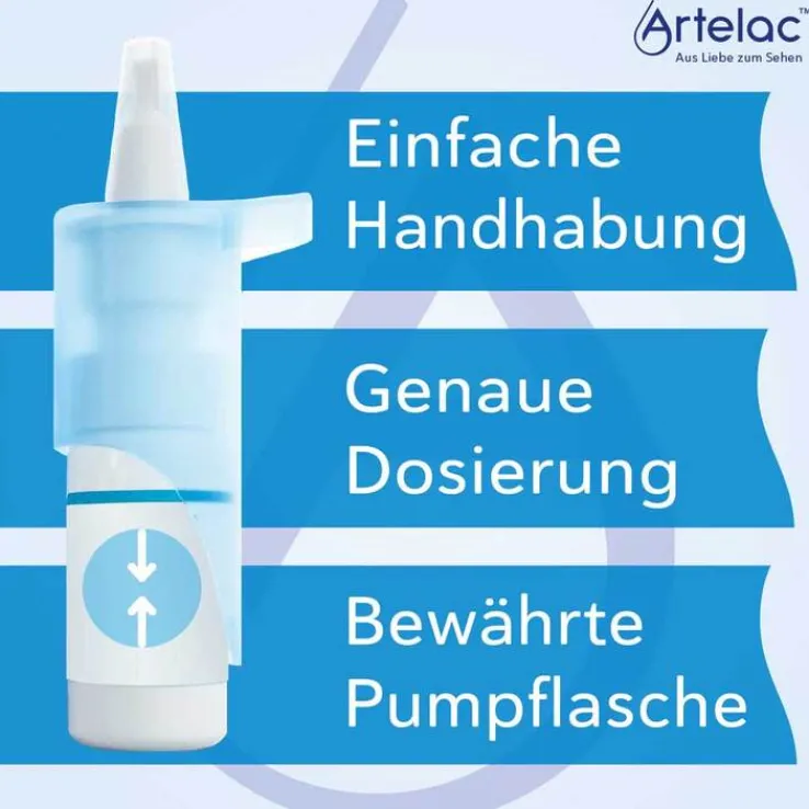 Artelac® Splash MDO® lindert schnell und langanhaltend Symptome des trockenen Auges. Der natürliche Feuchtigkeitsspender Hyaluronsäure liegt in einer Konzentration von 0,24 % vor, wodurch die Stabilität des Tränenfilms verbessert und Wasser im Tränenfilm gebunden wird. Der patentierte Pumpmechanismus von Artelac® Splash MDO® bietet eine sichere und intuitive Handhabung. Es ist konservierungsmittelfrei und daher sehr gut verträglich.