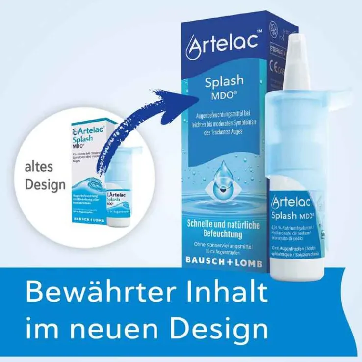 Pflichtangaben: Artelac® Splash (EDO/MDO): Hersteller: Dr. Gerhard Mann chem.-pharm. Fabrik GmbH*, Vertrieb: Bausch & Lomb GmbH* *Brunsbütteler Damm 165 /173, 13581 Berlin