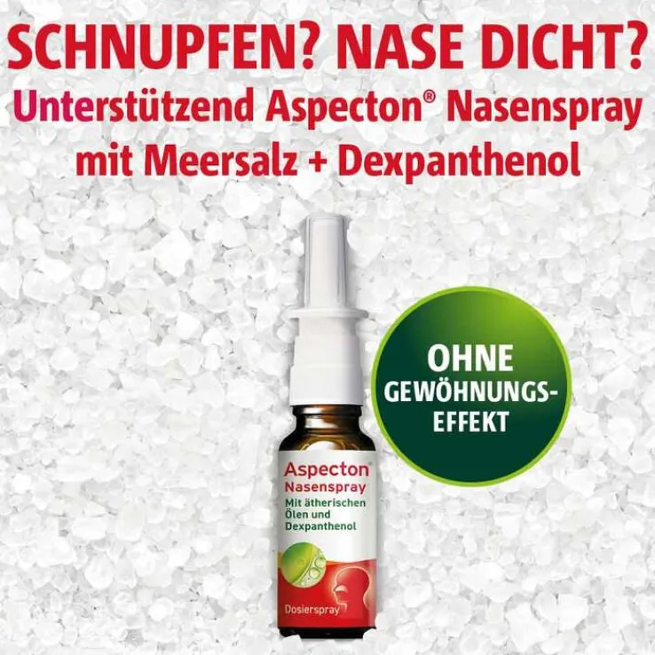 Anders als reine Meersalzsprays beinhaltet Aspecton® Nasenspray eine einzigartige Kombination aus einer hypertonen Meersalzlösung (emtspricht einer 1,5 %igen Kochsalz-Lösung), pflegendem Dexpanthenol, befeuchtender und schützender Hypromellose sowie ätherischen Ölen (u.a. Thymian-, Eukalyptus- und Minzöl).