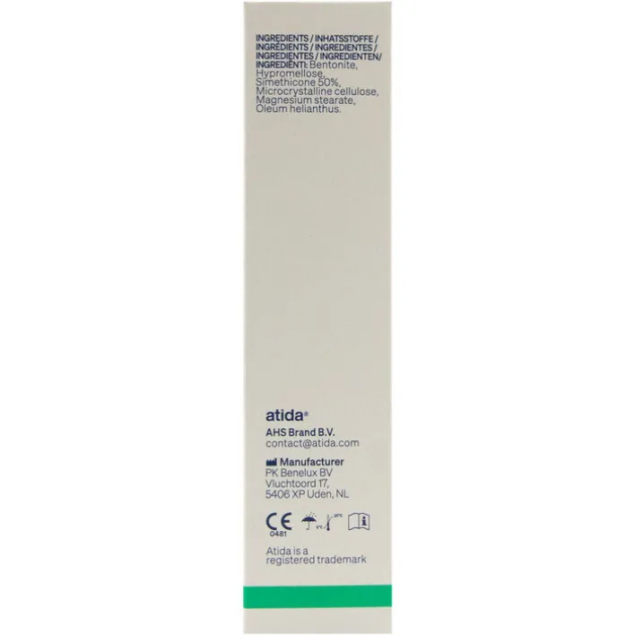 Die Inhaltsstoffe sind natürliche Tonerde (Magnesium-Aluminium-Silikat) und Simeticon. Die Inhaltsstoffe in Atida Anti-Durchfall-Kapseln werden nicht über den Darm aufgenommen. Natürliche Tonerde adsorbiert Giftstoffe, Bakterien und Viren und verhindert, dass sie sich an den Darmschleimhäuten festsetzen. Simeticon ermöglicht Gasblasen im Magen und Darm sich leichter zu verbinden, sodass diese leichter abtransportiert werden können.