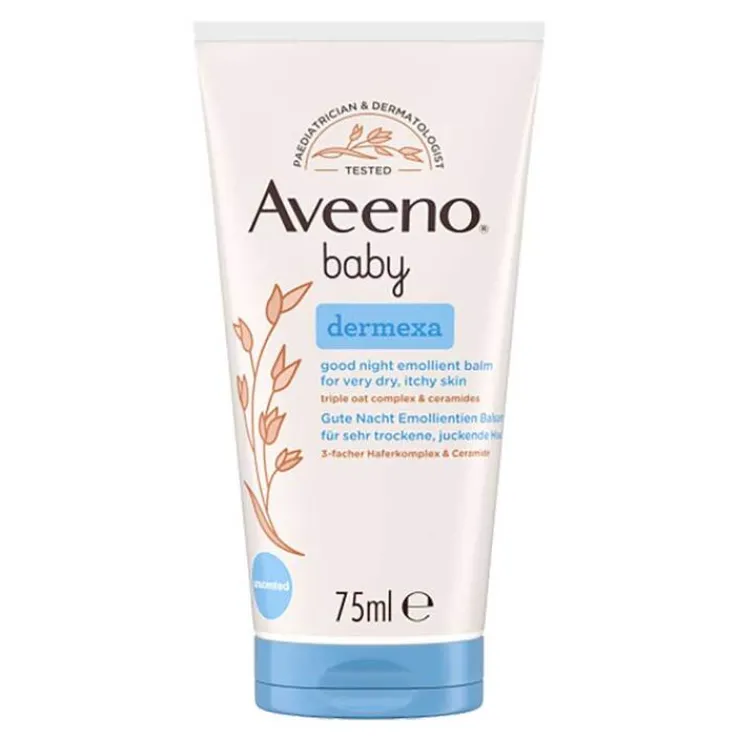 Aveeno baby Dermexa gute Nacht Emollientien Balsam mit dem 3-fachem Haferkomplex & Ceramide beruhigt sehr trockene, juckende Babyhaut & spendet intensive Feuchtigkeit – klinisch erwiesen. Es ist für Neugeborene und Kinder mit sehr trockener, juckender und zu Neurodermitis neigender Haut geeignet.