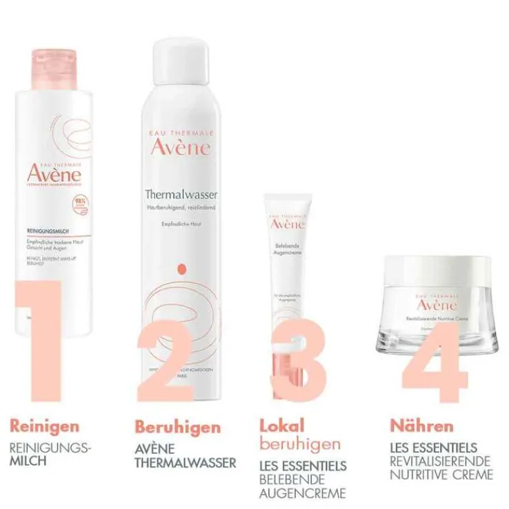 - 2. Avene Thermalwasser großzügig auf die Haut aufsprühen. Sanft abtrocknen.