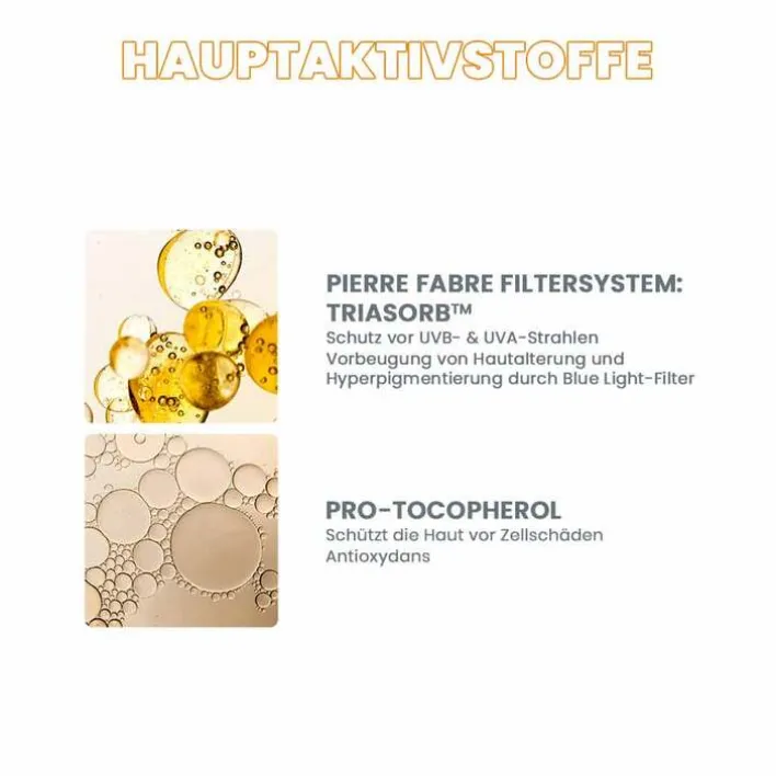 TriAsorB™: unser 1. organischer Sonnenfilter, bewahrt die Haut vor UVB- und UVA-Strahlen. Und er schützt auch vor dem kurzwelligen blauen Anteil des Tageslichts, dem sogenannten HEV-Blue-Light und bietet somit einen zusätzlichen Schutz vor Hautalterung und Hyperpigmentierung infolge kurzwelligem Blue Light.