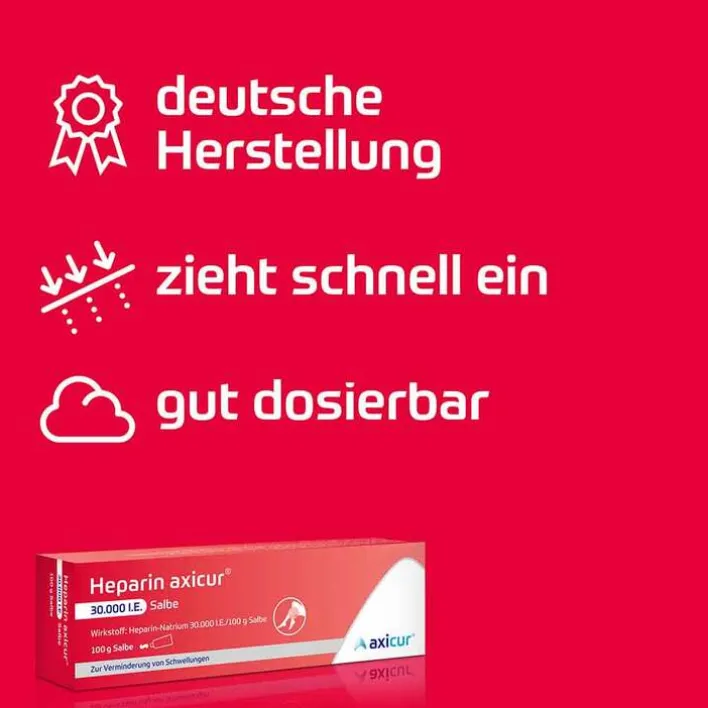Heparin axicur® 30.000 I.E. Salbe. Wirkstoff: Heparin-Natrium Anwendungsgebiete: Zur Verminderung von Schwellungen. Anwendung auf der Haut zur unterstützenden Behandlung bei akuten Schwellungszuständen nach stumpfen Verletzungen (Prellungen, Blutergüsse). Enthält Sorbinsäure, Kaliumsorbat, Cetylstearylalkohol, Propylenglycol und Sojalecithin. Packungsbeilage beachten. Zu Risiken und Nebenwirkungen lesen Sie die Packungsbeilage und fragen Sie Ihre Ärztin, Ihren Arzt oder in Ihrer Apotheke. axicorp Pharma GmbH, 61381 Friedrichsdorf. Stand: April 2022