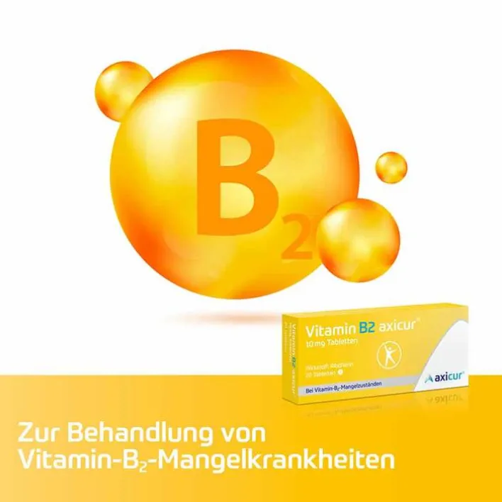Vitamin B2 axicur® 10 mg Tabletten Wirkstoff: Riboflavin. Anwendungsgebiete: Zur Behandlung von klinischen Vitamin-B 2 -Mangelzuständen, die ernährungsmäßig nicht ausgeglichen werden können. Enthält Lactose. Packungsbeilage beachten. Zu Risiken und Nebenwirkungen lesen Sie die Packungsbeilage und fragen Sie Ihre Ärztin, Ihren Arzt oder in Ihrer Apotheke. axicorp Pharma GmbH, 61381 Friedrichsdorf. Stand: April 2022