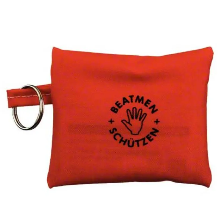 Kompaktes Infektionsschutzset für Hosentasche oder Schlüsselbund, immer dabei, immer einsatzbereit. Verringert die Hemmschwelle bei der Atemspende, bietet guten Schutz für Helfer und Patient. Mini-Reißverschlusstasche, ca. 90 × 75 mm, aus beschichtetem Nylongewebe, orange, mit praktischem Schlüsselring. Robust, leicht, wenig Platzbedarf. Beschriftung und Motiv im Siebdruck.