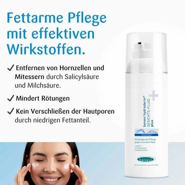 Das Benevi Hydroderm Gesichts-Fluid plus ist eine leichte, fettarme Pflege für unreine Haut, die zu Mitessern, Pickeln und verstopften Poren neigt. Auch unreine Haut braucht Feuchtigkeit – doch viele herkömmliche Cremes sind zu reichhaltig und können neue Unreinheiten fördern. Das nicht komedogene Fluid plus pflegt gezielt, ohne zu fetten oder die Poren zu verstopfen. Salicyl- & Milchsäure sowie Niacinamid helfen, abgestorbene Hautzellen zu lösen, Talg zu regulieren und das Hautbild sichtbar zu verbessern.