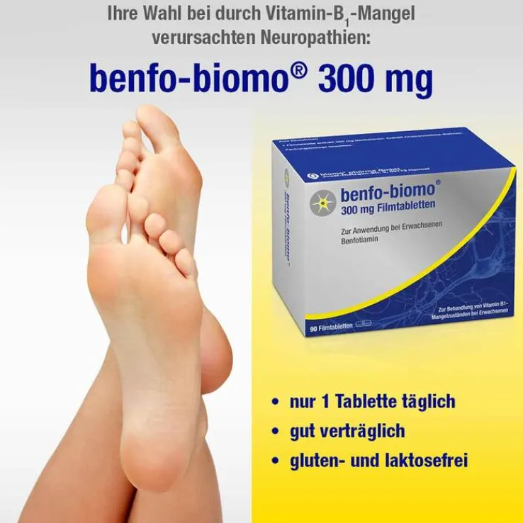 Benfo-biomo® 300 mg Filmtabletten. Anwendungsgebiete: Zur Behandlung von Vitamin-B1 -Mangelzuständen, falls dies durch eine angemessene Ernährung nicht behoben werden kann. Zu Risiken und Nebenwirkungen lesen Sie die Packungsbeilage und fragen Sie Ihre Ärztin, Ihren Arzt oder in Ihrer Apotheke. biomo pharma GmbH
