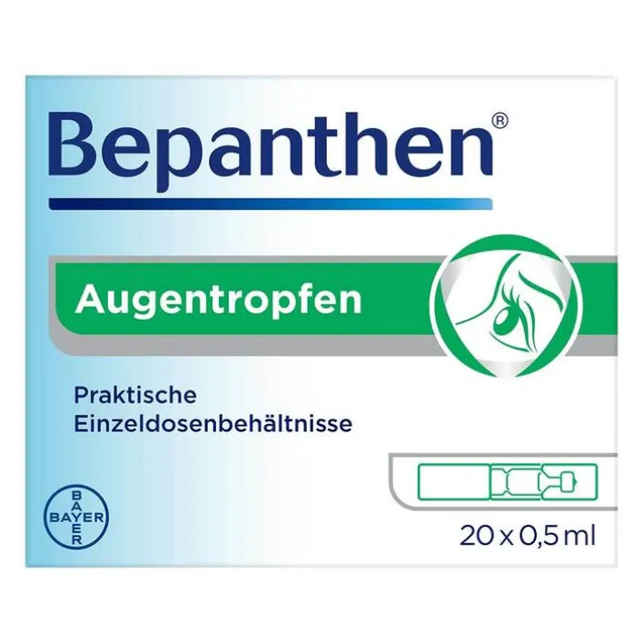 Wer an trockenen und gereizten Augen leidet, kann mit den Bepanthen® Augentropfen die Augenoberfläche befeuchten, den Tränenfilm stabilisieren und somit das Auge vor einem Trockenheitsgefühl schützen. Auf diese Weise wird eine Linderung der Beschwerden erreicht. Die Bepanthen® Augentropfen sind erhältlich als Ein-Dosis-Behältnis (praktisch für unterwegs) und in der Soft-Touch-Mehrdosisflache (insbesondere zur regelmäßigen Anwendung). Die Augentropfen enthalten weder Konservierungsstoffe noch Phosphate. Sie sind für Kontaktlinsenträger geeignet.