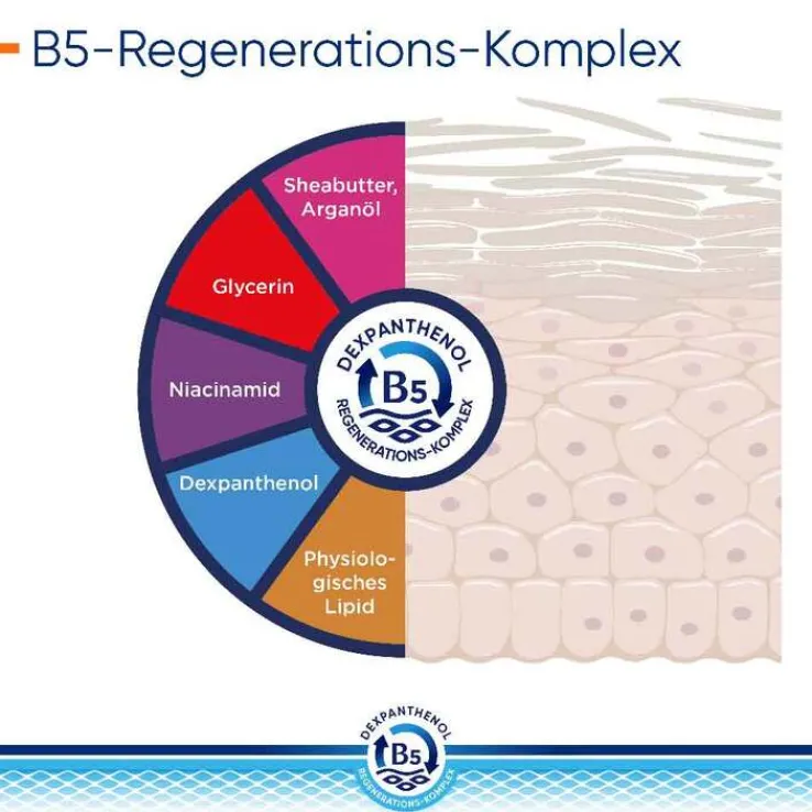 Der B5-Regenerations-Komplex unterstützt die Regeneration der Haut – von innen nach außen. Dabei fördert Dexpanthenol in tieferen Hautschichten der Epidermis die natürliche Zellregeneration. Das enthaltene Glycerin spendet sofortige und lang anhaltende Feuchtigkeit. Niacinamid (Vitamin B3) beruhigt juckende, trockene Haut und natürliche Lipide wie Sheabutter und Arganöl ergänzen fehlende Hautlipide. Das physiologische Lipid unterstützt zusätzlich die Anordnung der Doppellipidschicht.