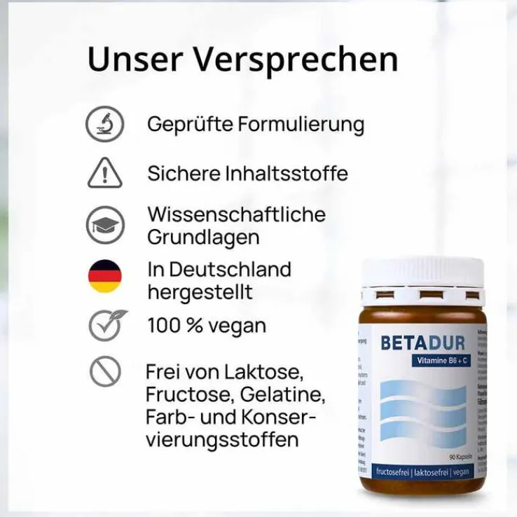 - Mit Betadur© Kapseln versorgen Sie sich täglich mit 107 % des Tagesbedarfs (NRV*) an Vitamin B6 und 125 % des Tagesbedarfs (NRV*) an Vitamin C.