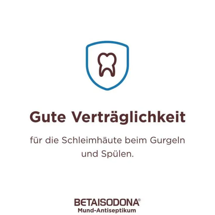 Betaisodona® Mund-Antiseptikum 75 mg/ml Lösung zur Anwendung in der Mundhöhle für Kinder ab 6 Jahren und Erwachsene Wirkstoff: Povidon-Iod. Anwendungsgebiete: Betaisodona® Mund-Antiseptikum ist ein keimtötendes Mittel (Antiseptikum) zur Anwendung in der Mundhöhle. Betaisodona® Mund-Antiseptikum wird einmalig angewendet zur antiseptischen Behandlung wie z. B. vor op. Eingriffen, insbes. bei Pat. mit Störungen der körpereigenen Abwehr (Vorbeugung lokaler Wundinfektionen); bei Pat. mit dem Risiko einer Entzündung der Herzinnenhaut und der Herzklappen (Vorbeugung der Bakteriämie). Betaisodona® Mund-Antiseptikum wird wiederholt zeitlich begrenzt angewendet zur Vorbeugung der strahlenbedingten Entzündung der Mundschleimhaut bei Patienten unter Strahlentherapie bzw. kombinierter Strahlen – und Chemotherapie. Warnhinweise: Enthält 36 Vol.-% Alkohol. Arzneimittel für Kinder unzugänglich aufbewahren. Packungsbeilage beachten. Zu Risiken und Nebenwirkungen lesen Sie die Packungsbeilage und fragen Sie Ihre Ärztin, Ihren Arzt oder in Ihrer Apotheke. Stand: 10.24