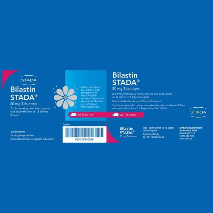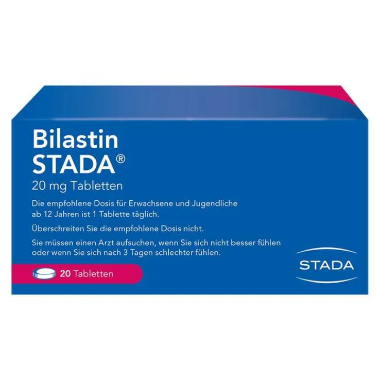Bilastin STADA® 20 mg Tabletten. Zur Anwendung bei Erwachsenen und Jugendlichen ab 12 Jahren Wirkstoff: Bilastin. Linderung der Beschwerden von Heuschnupfen (Niesen, juckende, laufende, verstopfte Nase und rote und tränende Augen) sowie anderer Formen allergischer Rhinitis. Es kann auch angewendet werden, um juckende Hautausschläge (Nesselsucht oder Urtikaria) zu behandeln. Hinweis: Überschreiten Sie die empfohlene Dosis nicht. Zu Risiken und Nebenwirkungen lesen Sie die Packungsbeilage und fragen Sie Ihre Ärztin, Ihren Arzt oder in Ihrer Apotheke. STADA Consumer Health Deutschland GmbH, Stadastraße 2–18, 61118 Bad Vilbel Stand: Januar 2025