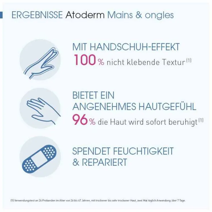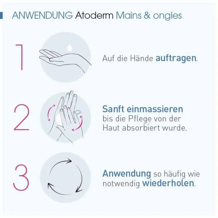 Die schnell einziehende Hand-und Nagelcreme Atoderm Mains Handcreme und beruhigt trockene und raue Hände und Fingernägel ohne zu fetten. Sie ist ideal für die Anwendung nach häufiger Händedesinfektion.