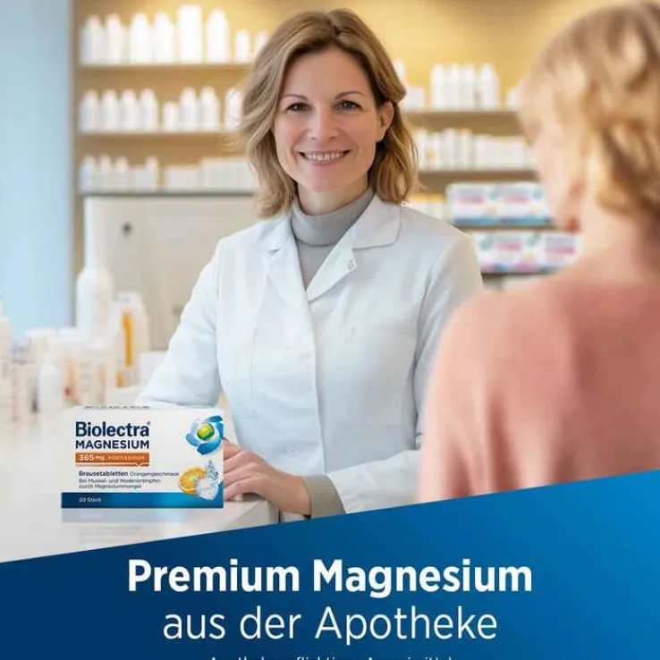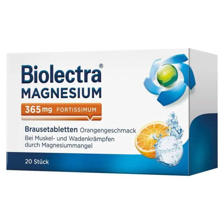 Biolectra® MAGNESIUM 365 mg fortissimum Brausetabletten Orangengeschmack Anwendungsgebiete: Nachgewiesener Magnesiummangel, wenn er Ursache für Störungen der Muskeltätigkeit (neuromuskuläre Störungen, Wadenkrämpfe) ist. Hinweise: Enthält Natrium, Kalium, Sorbitol und Saccharose. Zu Risiken und Nebenwirkungen lesen Sie die Packungsbeilage und Fragen Sie Ihre Ärztin, Ihren Arzt oder in Ihrer Apotheke. Stand 12/2023