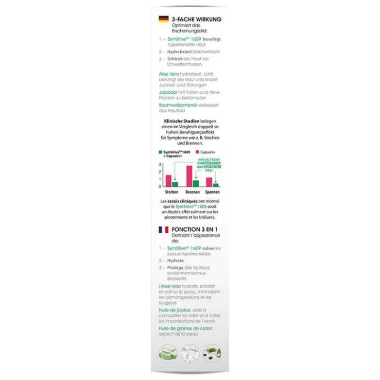 - SymSitive® 1609: vermindert Überreaktionen der Haut und wirkt dadurch hautberuhigend. Reduziert signifikant Hautempfindungen wie beispielsweise Brennen, Stechen und Hautspannungen.