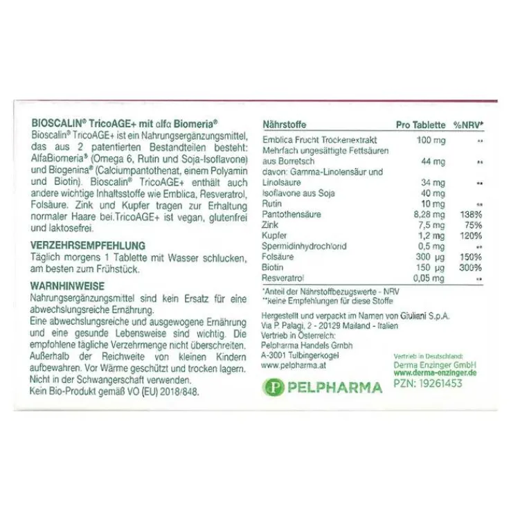 Bioscalin Trico Age+ ist ein Nahrungsergänzungsmittel, das aus 2 patentierten Bestandteilen besteht: Alfa Biomeria (Omega 6, Rutin und Soja- Isoflavone) und Biogenina (Calciumpantothenat, einem Polyamin und Biotin). Bioscalin Tricoage+ enthält auch andere wichtige Nährstoffe wie Emblica, Resveratrol, Folsäure, Zink und Kupfer. Zink und Kupfer tragen zur Erhaltung normaler Haare bei.