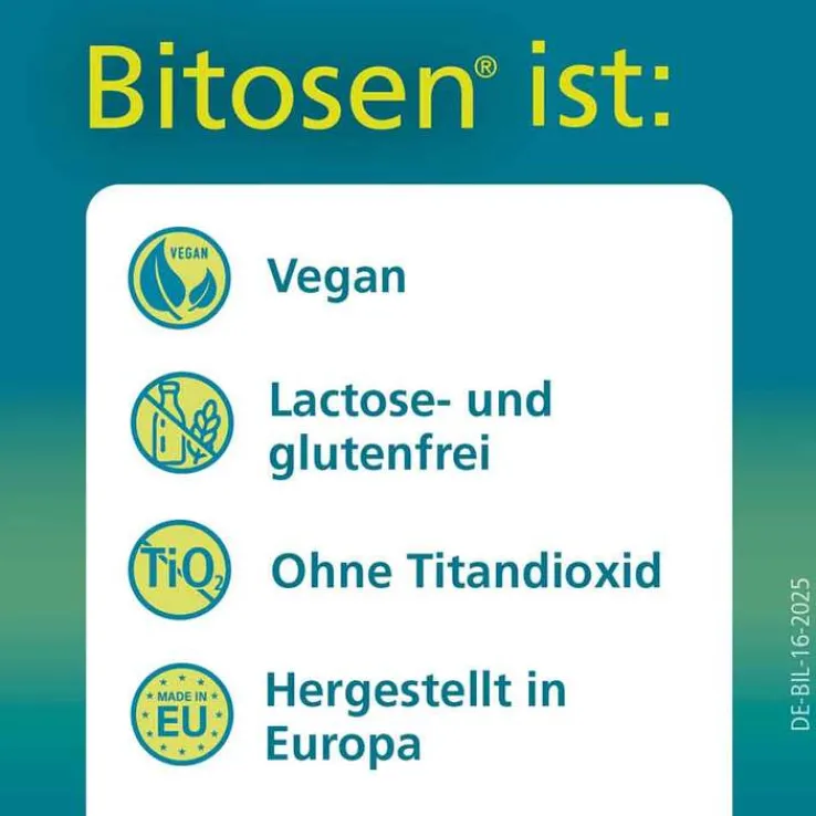 Bitosen® 20 mg Tabletten, Bitosen® 20 mg Schmelztabletten. Wirkstoff: Bilastin. Anwendungsgebiete: Für Erwachsene und Jugendliche ab 12 Jahren zur Linderung der Beschwerden von Heuschnupfen, anderer Formen allergischer Rhinitis sowie juckenden Hautausschlägen. Warnhinweis: Bitosen® 20 mg Schmelztabletten: Enthält Ethanol. Packungsbeilage beachten. Zu Risiken und Nebenwirkungen lesen Sie die Packungsbeilage und fragen Sie Ihre Ärztin, Ihren Arzt oder in Ihrer Apotheke. Pharmazeutischer Unternehmer: Menarini International Operations Luxembourg S.A., Mitvertrieb durch BERLIN-CHEMIE AG, 12489 Berlin.