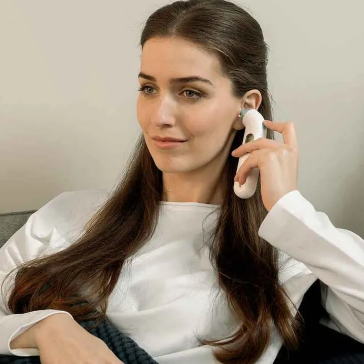 - Führen Sie den Messkopf möglichst weit in den Gehörgang ein und drücken Sie die Starttaste. Ein Piepton weist auf eine normale Temperatur hin. Die hörbare Temperaturerkennung löst zwei aufeinanderfolgende Pieptöne aus, wenn die Messung 37,5 °C (99,5 °F) oder höher anzeigt, bzw. vier Pieptöne bei 38,6 °C (101,5 °F) oder höher. Das Ergebnis wird auf dem Display angezeigt.