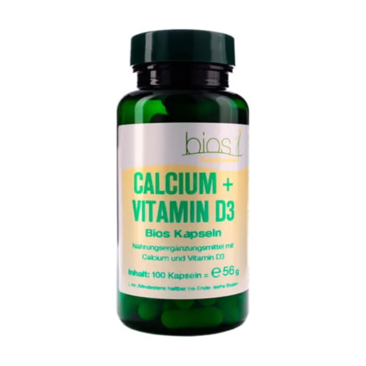 Calcium + Vitamin D3 Bios Kapseln enthalten 133 mg Calcium als Calciumcarbonat und Calciumcitrat und zusätzlich 0,83 µg Vitamin D3 (Colecalciferol) in einer Hartgelatinekapsel. Sowohl Calcium als auch Vitamin D3 können zur täglichen Nahrungsergänzung empfohlen werden, wobei die empfohlenen Tageszufuhren 800 mg Calcium und 5 µg Vitamin D3 betragen (RDA).