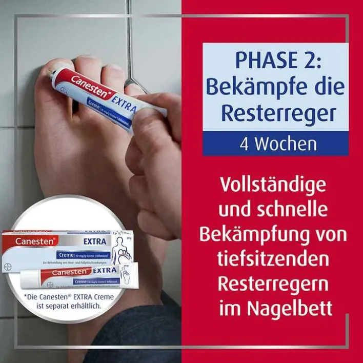 - Die 2-Phasen-Kurztherapie mit der Kombination aus dem Canesten® EXTRA Nagelset und der Canesten® EXTRA Creme bekämpft Nagelpilz schnell, gründlich und effektiv.