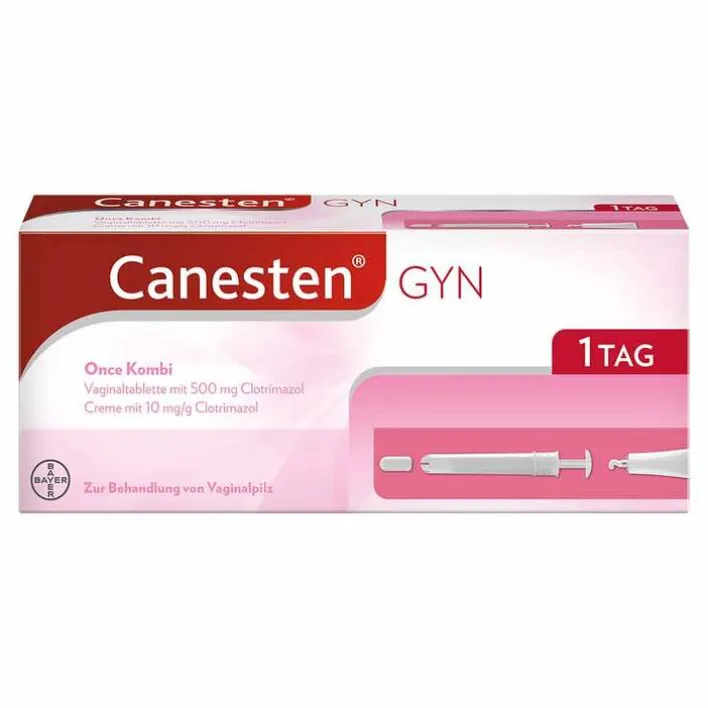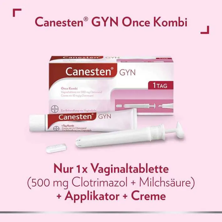 Canesten® GYN Once Kombi Wirkstoff: Clotrimazol Anwendungsgebiete Kombipackungen: Bei infektiösem Ausfluss, verursacht durch Hefepilze; Entzündungen der Scheide und Schamlippen durch Pilze – meist Hefepilze der Gattung Candida – sowie überlagernde Infektionen (Superinfektionen) mit Clotrimazol-empfindlichen Bakterien. Hinweis für Creme: Enthält Benzylalkohol und Cetylstearylalkohol. Packungsbeilage beachten! Zu Risiken und Nebenwirkungen lesen Sie die Packungsbeilage und fragen Sie Ihre Ärztin, Ihren Arzt oder in Ihrer Apotheke. Bayer Vital GmbH, 51368 Leverkusen, Deutschland. Stand: 09/2020