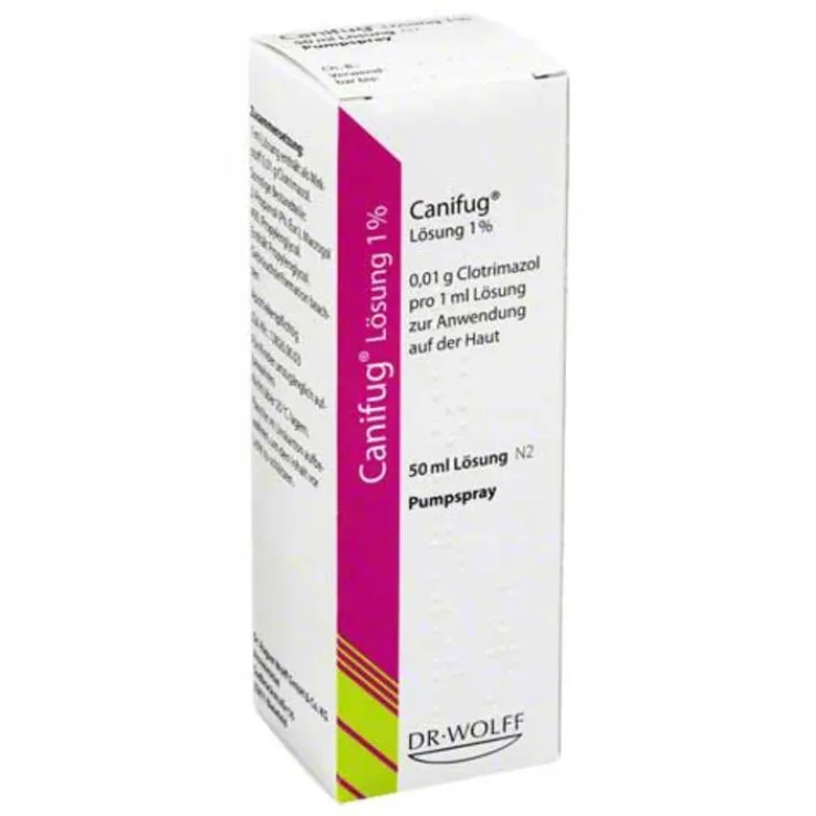 Canifug Lösung 1 % Wirkstoff: Clotrimazol. Anwendung: Pilzinfektionen der Haut durch Dermatophyten, Hefen (z. B. Candida-Arten), Schimmelpilze und andere, wie Malassezia furfur. Diese können sich äußern als Mykosen der Füße, Mykosen der Haut und der Hautfalten, Pityriasis versicolor, oberflächliche Candidosen. Warnhinweise: Enthält Propylenglycol. Packungsbeilage beachten. Zu Risiken und Nebenwirkungen lesen Sie die Packungsbeilage und fragen Sie Ihre Ärztin, Ihren Arzt oder in Ihrer Apotheke. Dr. August Wolff GmbH & Co.KG Arzneimittel