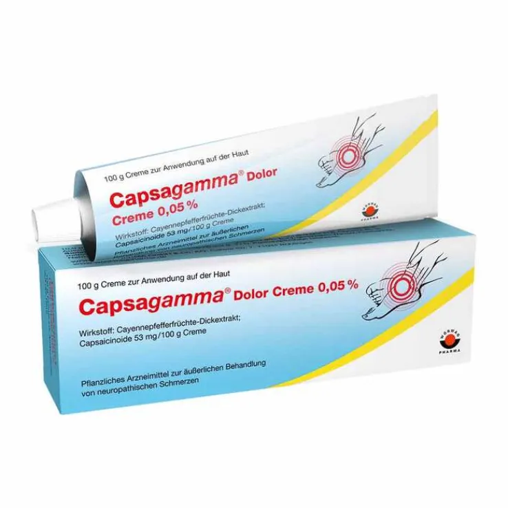 Capsagamma® Dolor Creme 0,05 %. Wirkstoff: Cayennepfefferfrüchte-Dickextrakt; Capsaicinoide 53 mg/100 g Creme. Anwendungsgebiete: Zur externen symptomatischen Therapie von leichten Fuß-/Unterschenkelschmerzen bei chronisch-schmerzhafter diabetischer Polyneuropathie (im Rahmen eines therapeutischen Gesamtkonzeptes) bei Erwachsenen. Zu Risiken und Nebenwirkungen lesen Sie die Packungsbeilage und fragen Sie Ihre Ärztin, Ihren Arzt oder in Ihrer Apotheke. Wörwag Pharma GmbH & Co. KG, 71034 Böblingen