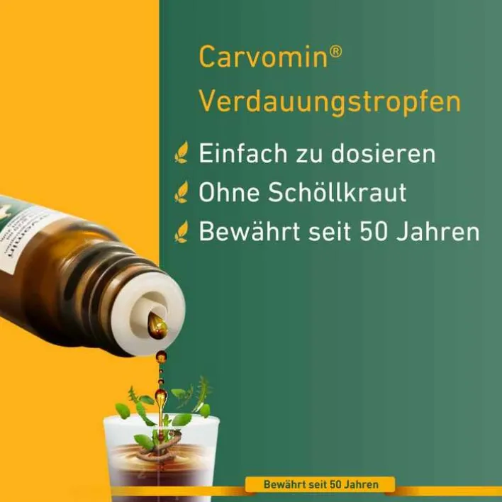 Carvomin® Verdauungstropfen, 18,55 g/20 ml, Flüssigkeit zum Einnehmen: Wirkstoff: Auszug aus einer Mischung von Angelikawurzeln, Benediktenkraut und Pfefferminzblättern. Anwendungsgebiet: Traditionelles pflanzliches Arzneimittel zur Unterstützung der Verdauungsfunktion bei Erwachsenen ausschließlich auf Grund langjähriger Anwendung. Warnhinweise: Enthält 58 Vol.-% Alkohol. Arzneimittel f. Kinder unzugängl. aufbewahren. Stand: 04/23-2. Zu Risiken und Nebenwirkungen lesen Sie die Packungsbeilage und fragen Sie Ihre Ärztin, Ihren Arzt oder in Ihrer Apotheke. Klinge Pharma GmbH, 83607 Holzkirchen, Deutschland