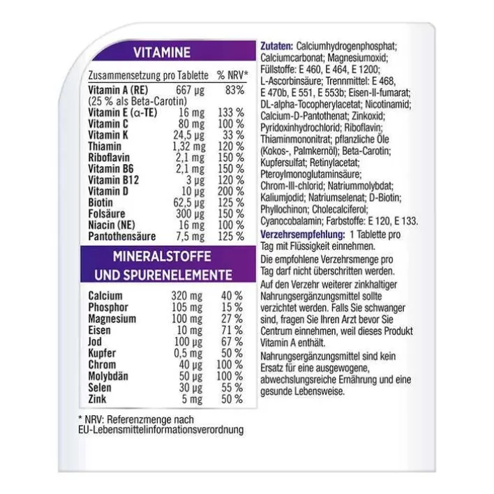 Calciumhydrogenphosphat; Calciumcarbonat; Magnesiumoxid; Füllstoffe: E 460, E 464, E 1200; L-Ascorbinsäure; Trennmittel: E 468, E 470b, E 551, E 553b; Eisen-II-fumarat; DL-alpha-Tocopherylacetat; Nicotinamid; Calcium-D-Pantothenat; Zinkoxid; Pyridoxinhydrochlorid; Riboflavin; Thiaminmononitrat; pflanzliche Öle (Kokos-, Palmkernöl); Beta-Carotin; Kupfersulfat; Retinylacetat; Pteroylmonoglutaminsäure; Chrom-III-chlorid; Natriummolybdat; Kaliumjodid; Natriumselenat; D-Biotin; Phyllochinon; Cholecalciferol; Cyanocobalamin; Farbstoffe: E 120, E 133.