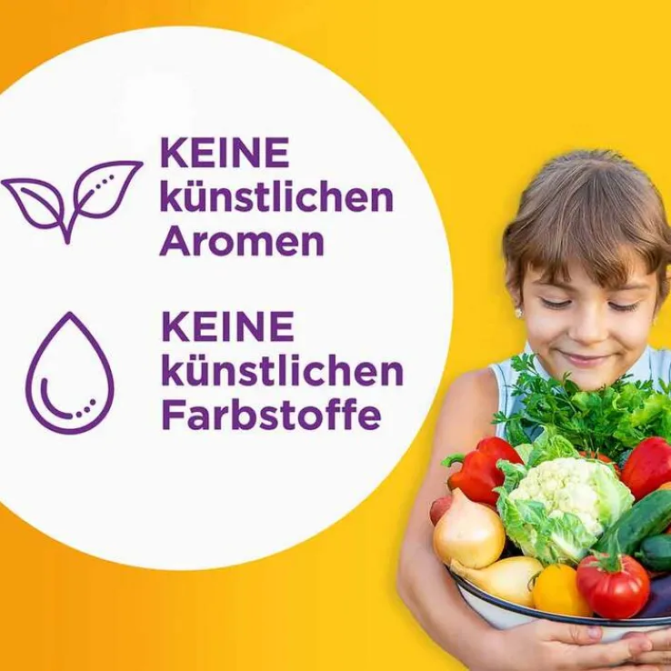 Nahrungsergänzungsmittel mit Vitaminen und Mineralstoffen für Kinder ab 4 Jahren. Mit Kirsch-, Orangen- und Beerengeschmack.