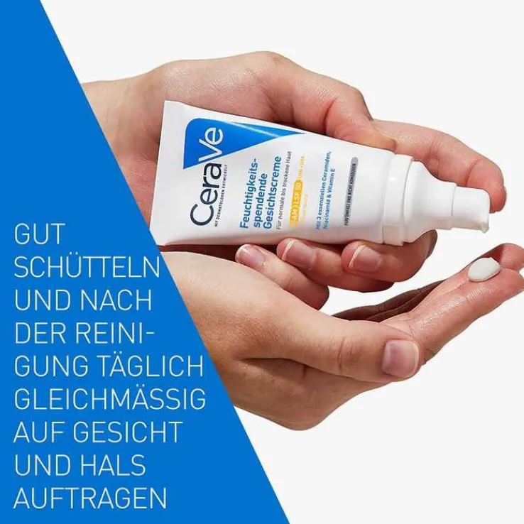 Die CeraVe feuchtigkeitsspendende Gesichtscreme mit LSF 50 ist für normale bis trockene Haut geeignet. Sie schützt vor täglicher UVA- und UVB-Strahlung und Umwelteinwirkungen. Drei essenzielle Ceramide helfen bei der Erneuerung der Hautschutzbarriere und in Kombination mit der MVE-Technologie wird die Haut kontinuierlich und intensiv mit Feuchtigkeit versorgt – bis zu 24 Stunden.