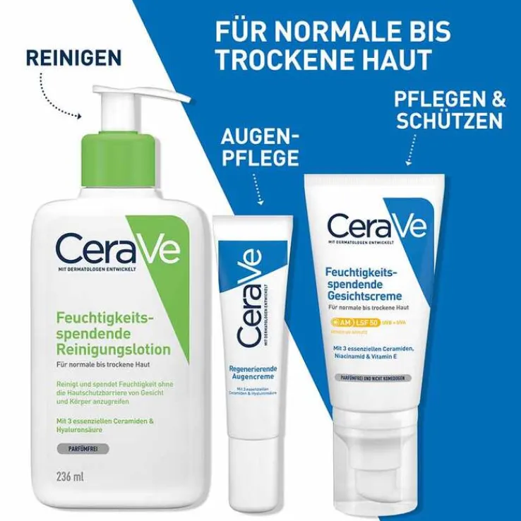 Die CeraVe regenerierende, glättende Augencreme eignet sich für normale bis trockene Haut. Die Augencreme enthält hochwirksame Inhaltsstoffe, wie Hyaluron und die drei essenziellen Ceramide 1, 3 und 6-II, die die empfindliche Haut um die Augen mit Feuchtigkeit versorgen und die Erneuerung der natürlichen Hautschutzbarriere unterstützen.
