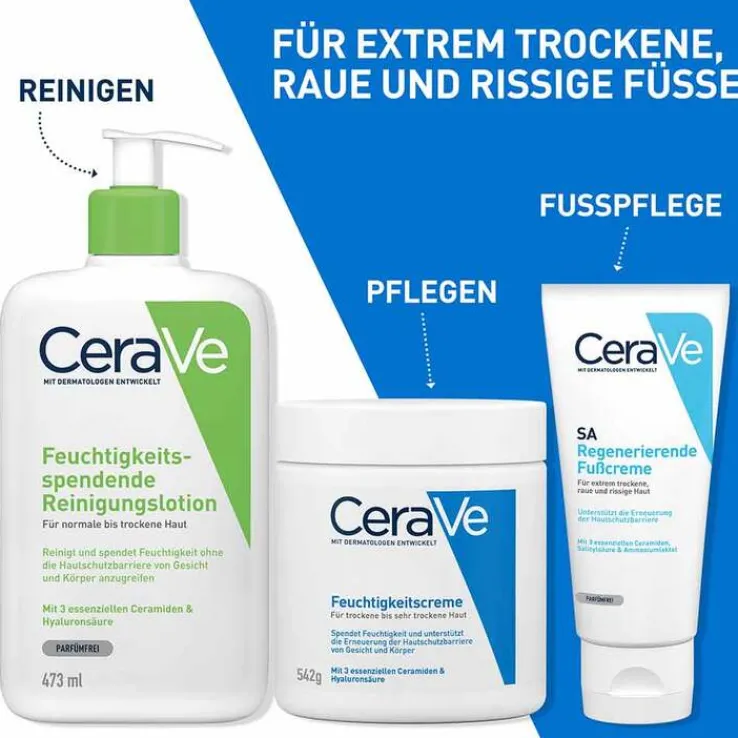 Die CeraVe SA regenerierende Fußcreme enthält eine Kombination aus drei essenziellen Ceramiden 1, 3 und 6-II, die die besonders angegriffenen und trockenen Füße beim Aufbau einer gesunden Hautschutzbarriere unterstützt.