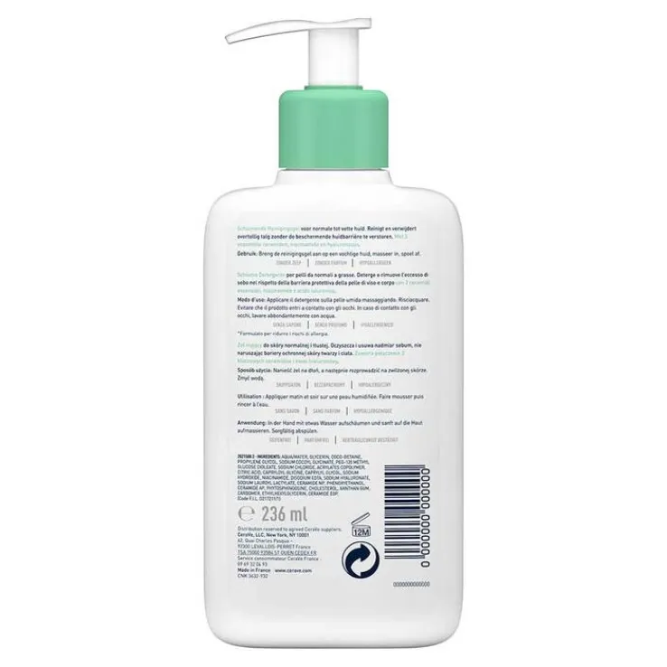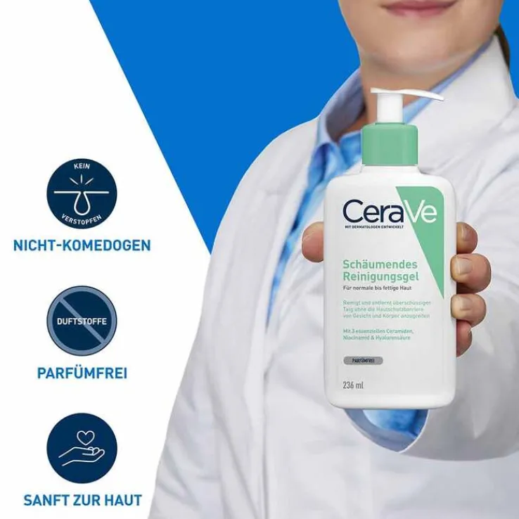 CeraVe schäumendes Reinigungsgel für normale bis fettige Haut Die pflegende Reinigung mit feuchtigkeitsspendendem Hyaluron, drei essenziellen Ceramiden, beruhigendem Niacinamid und Glycerin reinigt effektiv und unterstützt dabei die hauteigenen Schutzmechanismen der Haut. Das pflegende Reinigungsgel eignet sich für Gesicht und Körper .