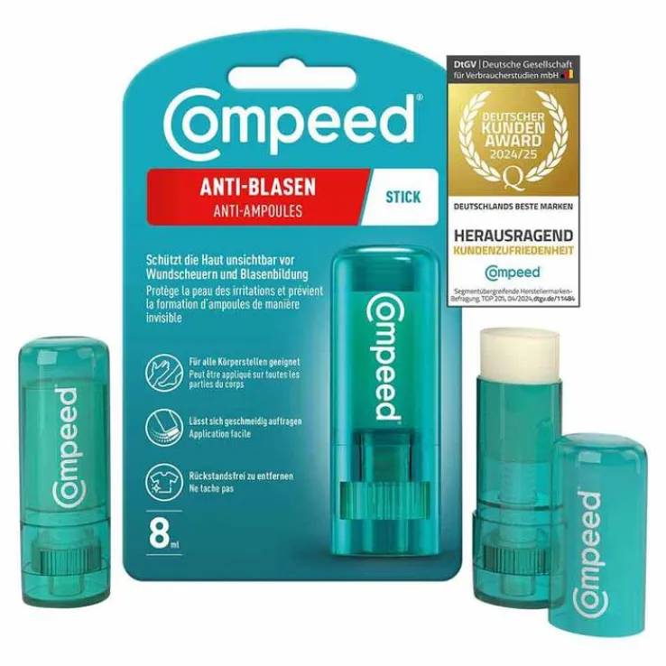 Der Compeed® Anti-Blasen Stick hilft unsichtbar, Reibung und Wundscheuern vorzubeugen. Somit ist der Compeed® Anti-Blasen Stick effektiv in der Vorbeugung von Blasen. Er verhindert die Blasenbildung bei 9 von 10 Konsumenten*. Der Stick ist nicht nur für wunde Stellen an den Füßen geeignet. Der pflegende Fettfilm kann auch an anderen Stellen des Körpers aufgetragen werden, wann immer stärkerer Reibung auftreten. Da die Fettschicht des Sticks auf Pflanzenöl basiert, wird die Haut gleichzeitig gepflegt und somit geschmeidig gehalten.