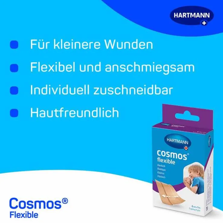 cosmos® flexible eignet sich zum Schutz von kleineren Wunden und Bagatellverletzungen. Das Pflaster kann individuell auf die Wundgröße zugeschnitten werden und ist dadurch flexibel einsetzbar. cosmos® flexible ist hautfreundlich, luftdurchlässig und wasserabweisend. Durch das querelastische Textilgewebe haftet das Pflaster sicher an vielen Körperstellen. Der natürliche Heilungsprozess kann durch das Abdecken der Wunde mit cosmos® flexible unterstützt werden.