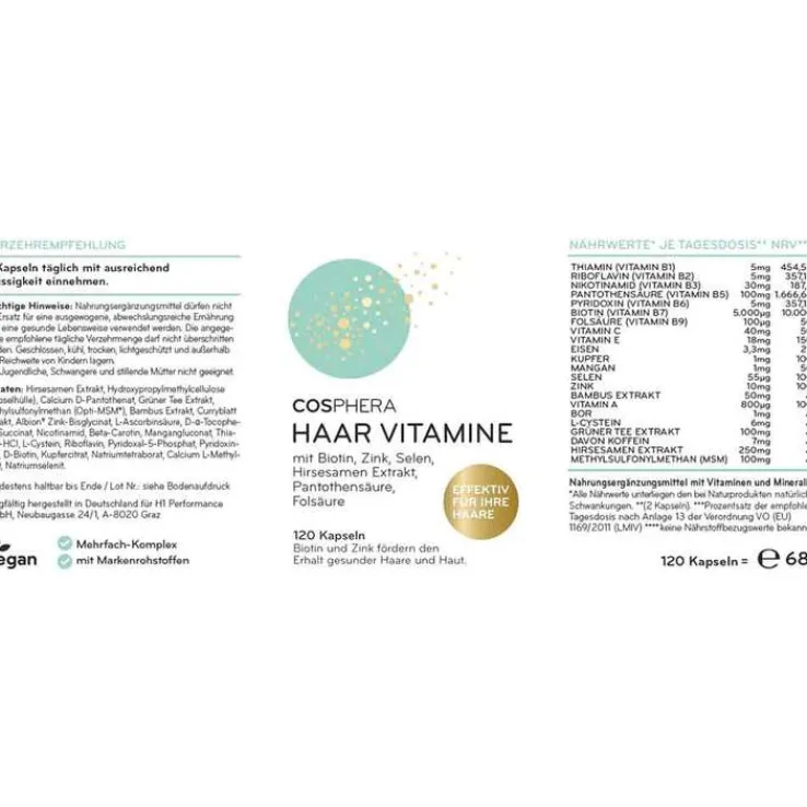 Cosphera Haar-Vitamine mit Hirse-Kapseln enthalten Vitamine und Mineralien. Es sind sieben B-Vitamine, Vitamin C+E, Zink, Selen, Hirse Samen Extrakt, Grüner Tee Extrakt, L-Cystein und MSM enthalten. Die Komponenten sind optimal aufeinander abgestimmt und können bei Haarausfall und Haarwuchs unterstützen*.