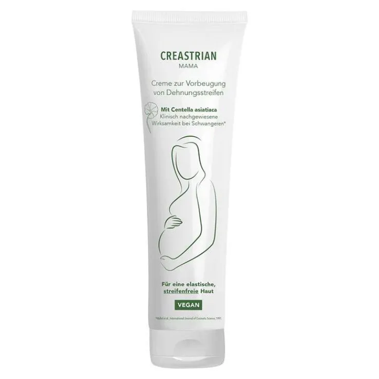 Wissenschaftlich bestätigte Wirksamkeit: In einer klinischen Studie (Mallol et al., 1991) entwickelten 90 % der vorbelasteten Frauen, die bereits aus der Pubertät Dehnungsstreifen hatten, mit Creastrian Mama keine neuen Schwangerschaftsstreifen.